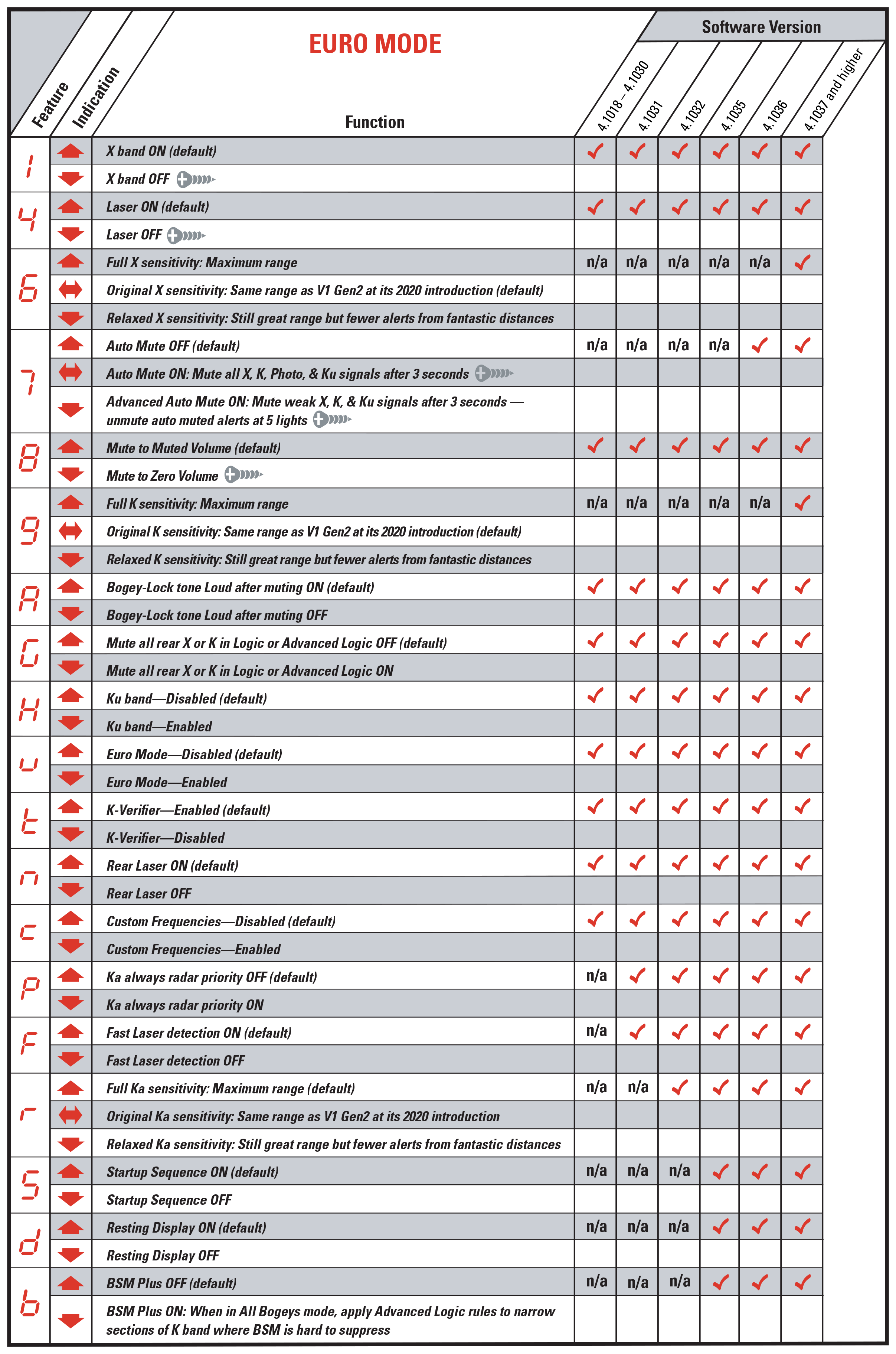 - All V1 Gen2s are shipped from the factory in “USA Mode.” To verify your current status, repeatedly press-and-hold the Control Button for 1.5 seconds to cycle through the Analyzer Modes. If you see “A,” “small L,” “cap L,” click here for the USA Mode programming chart. If you see “U,” then “small U,” click here for the Euro Mode programming chart.